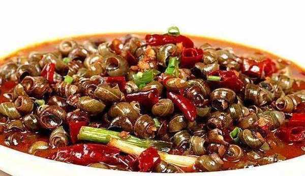 4、最後加香菜、幹辣椒、料酒炒出香味,加適量水,淹沒田螺,中火燒至水分將幹,加入少許味精即可出鍋~
