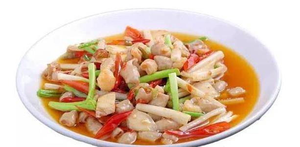 2、將粉腸節、筍絲、芹菜節過油,下入薑片、蒜片、泡椒炒香,調入鹽、雞精、味精、料酒、胡椒粉、泡椒末,炒勻後水淀粉勾芡,淋泡椒油,點綴小蔥節即可。