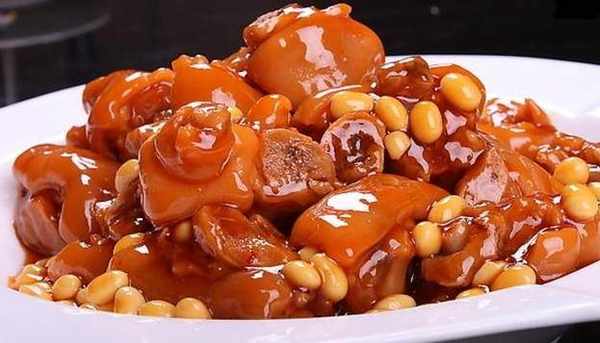 四、立即倒入豬蹄,翻炒,使豬蹄上色;