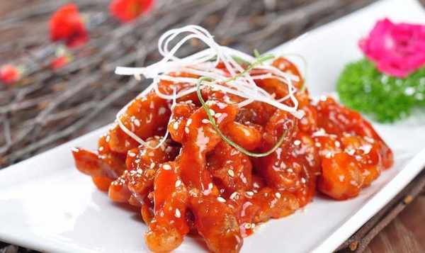 3、熱鍋倒油,把油燒熱至6成熟(油面向四周翻動,略有青煙升起),放入裡脊肉炸至熟透撈出。待油溫上長9成熟時(油面的翻動轉向平靜,青煙四起並向上沖)復炸第二次,炸至表面金黃撈出。