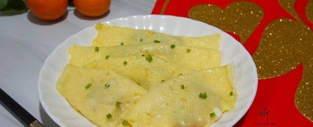3、取一個湯匙,表面塗上油,放入蛋液晃動,蛋液凝固後,將調整好的豬肉餡舀一湯匙,將蛋液對折。