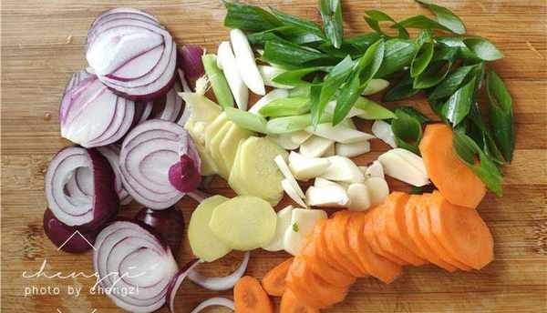 2、再準備胡蘿卜、洋蔥、香菜、薑、蒜、蔥這幾樣,除瞭胡蘿卜可以不放,其他是必須要有的。