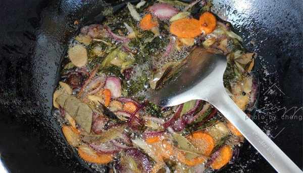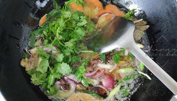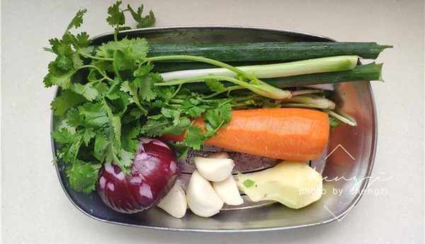 所用食材:八角,花椒粒,草果,肉蔻,桂皮,香葉,胡蘿卜,香菜,小蔥,洋蔥,薑,蒜