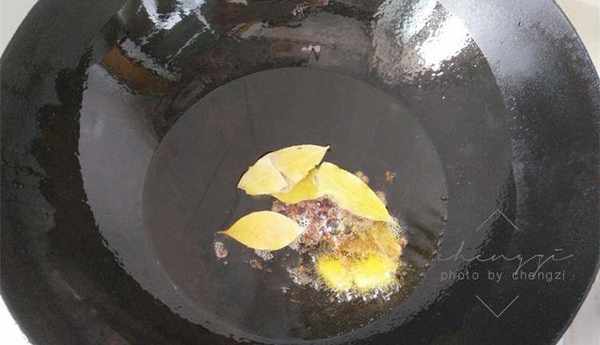 3、鍋內加入多一些的植物油,放入八角、桂皮、花椒粒、薑片、香葉,小火慢慢炸出香味,把香料撿出來扔掉,油燒至冒煙關火。