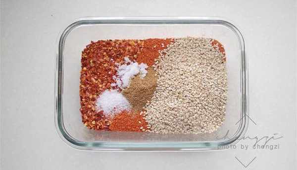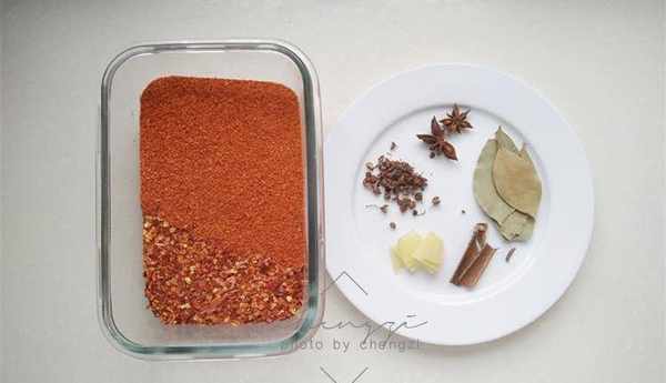 所用食材:辣椒粉,辣椒碎,熟白芝麻,桂皮,香葉,八角,薑,花椒,白糖,鹽,五香粉