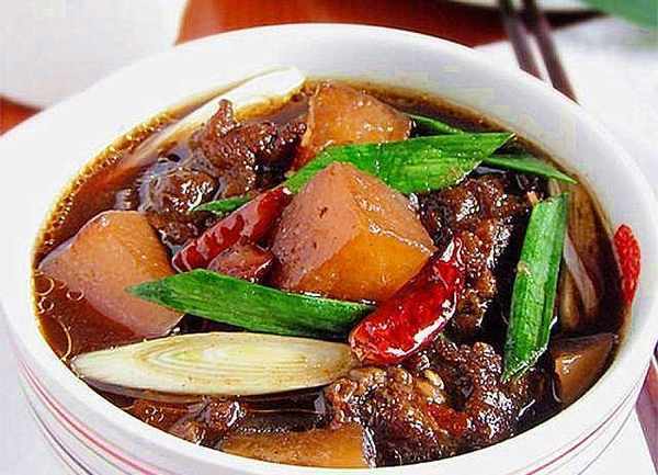 牛肉洗凈,切成隨意的小塊,白蘿卜洗凈,切成方丁。牛肉放入砂鍋中,放入薑片、蔥白、八角、桂皮,調入少許油和老抽,拌勻。保持小火,經常翻抖,煮待牛肉緊縮,香味濃鬱。倒入沒過牛肉的開水,加入幹紅椒和四物包。蓋上蓋子大火燒開轉中小火燉1小時。蘿卜丁放入無油的幹鍋小火翻炒片刻,至外表微黃。把蘿卜丁加入牛肉裡,蓋上蓋子大火燒開轉中火煮半小時。調入少許食鹽,加入青蒜,稍煮片刻即可。