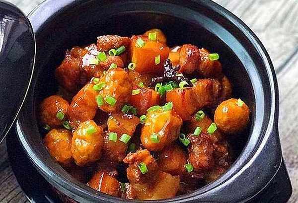 五花肉切小塊,冷水下鍋焯燙一下(鍋中放少許花椒粒、薑片、料酒)。撈出沖洗幹凈瀝水備用。鍋中放入少許油,放入冰糖小火炒至冰糖溶化呈紅棕色,放入五花肉翻炒上色。淋入花雕酒炒至酒汽收幹,加入薑片、八角、桂皮翻炒片刻。加入熱水沒過五花肉,加入醬油,加蓋大火煮開轉中小火慢燉30分鐘左右。鵪鶉蛋入鍋中煮熟去皮備用。放入油鍋炸至表面變黃,撈出備用。五花肉燒至水剩餘約一半時,加入適量鹽、炸好的鵪鶉蛋繼續加蓋燒20分鐘左右。當湯汁變少轉大火,大火翻炒至湯汁濃稠即可。