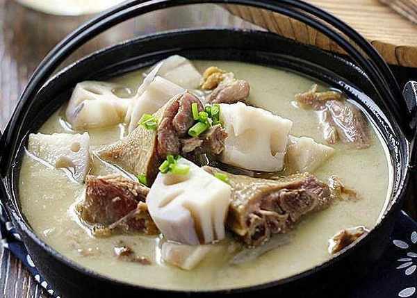 臘板鴨用熱水先浸泡1小時左右,減輕咸味,然後用水沖洗幹凈;切成小塊,準備些薑片;將鴨腿和薑片放入電飯煲中;按下電飯煲上燉煮的功能鍵,約1個小時;三、四分鐘時用鍋鏟翻炒一下;將鴨腿的油份微微煸炒出瞭,再加入蓮藕塊和適量的開水;蓋好蓋,繼續燉煮;燉煮一個小時後,湯色變成乳白,臘香飄出,撒少許白胡椒粉;盛入湯缽中,撒些切碎的小蔥花。