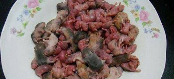 老鼠的叫聲是吱吱的叫,因此就有一道生食老鼠的菜叫三吱兒。這道菜必須取剛生下來的幼鼠直接食用,從夾起幼鼠、蘸料、到入口,幼鼠會叫三次,因此而得名。這道菜主要在福建、廣東地區流行。