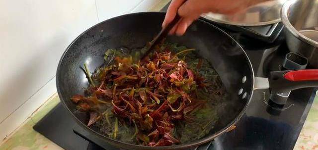 先放入香椿翻炒2分鐘後,再放入雞蛋一起翻炒,中間點2次少量冷水,這樣香椿香嫩可口