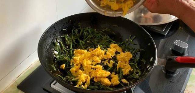 翻炒1分鐘就可以出鍋瞭,簡單又美味,關鍵顏色還好看,很多人做香椿炒雞蛋會把雞蛋和香椿放一起炒,其實這樣是不對的,不但顏色不好看,而且味道也不爽口。
