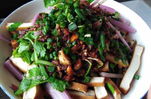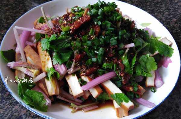 鍋內燒水,水開後,將其豆腐絲和芹菜節入鍋焯水,水開後即刻撈起,瀝幹水分,裝入盤中,讓其冷卻後,淋上紅油汁,這是用瞭平時的做法。