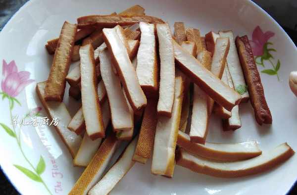 去瞭芹菜根,洗凈後切成節,聞著這芹菜香味很濃!豆腐幹切粗絲。