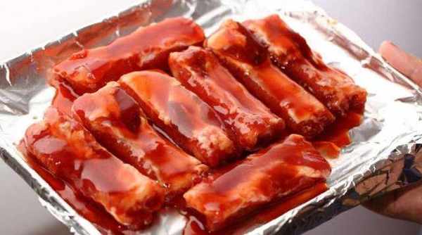4、約15分鐘後打開錫紙包,在排骨上多刷上幾層叉燒醬。溫度設置為6-7檔,繼續烤3分鐘後,再刷上一層蜂蜜即可食用。