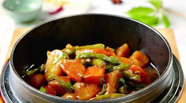 2、豆角撕去老筋去頭尾,土豆去皮切滾刀塊,蔥切段、薑切片;3、鍋中油熱後,放入蔥、薑、花椒、大料炒香,放入肉塊翻炒均勻,烹入料酒,