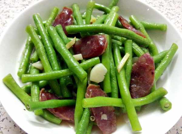 4、豆角撈出瀝水,跟香腸一起下熱油鍋爆炒