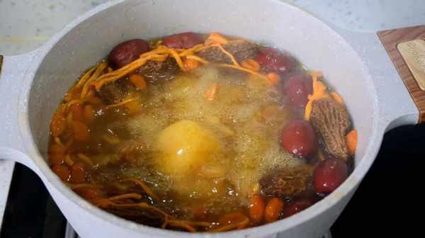 第三步:排骨入鍋,加入泡發的羊肚菌及枸杞、蟲草花、紅棗。