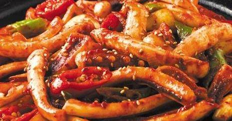 3.倒入魷魚翻炒變白,再倒入混合好的醬汁翻炒片刻至水分收幹