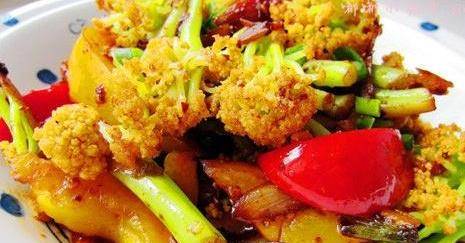4.放入菜花翻炒,放入調料調味,放入紅辣椒和蔥段略炒出鍋