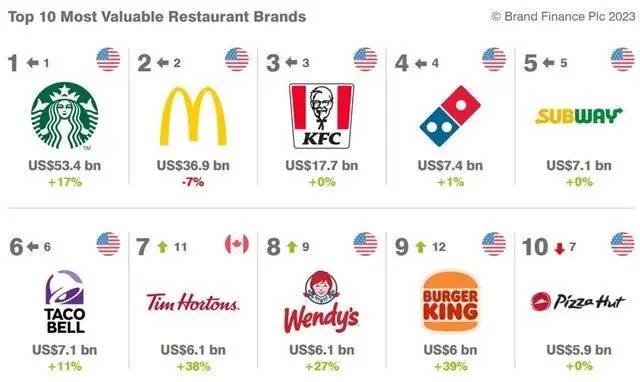 前五強沒有發生變化,星巴克(Starbucks)以534.32億美元(約合人民幣3670億元)連續七年成為全球最有價值餐廳品牌。緊隨其後的是麥當勞(McDonald's)、肯德基(KFC)、達美樂比薩(Domino's Pizza)、賽百味(Subway)。