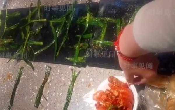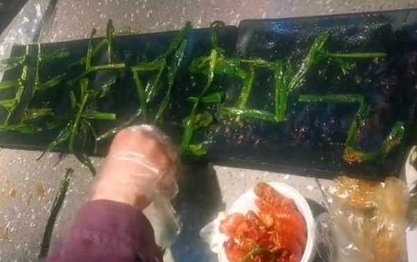 這個時候,一名女子帶著一次性手套,直接抓起一根根的韭菜,在餐桌上拼起瞭漢字,不久的功夫,“韭菜難吃”四個大字就拼好瞭,旁邊的閨蜜很是配合,有人拿出手機在拍攝,還有人再用韭菜拼瞭三個大感嘆號,更是加強瞭難吃的現實!