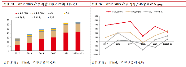 產品結構升級、量價齊升驅動營收增長,2023年劍指百億。在消費升級的背景下,近年公司收入增長迅速。公司預估2022年營業收入78.5億元,同比增長22.18%,2017-2022年營業收入累計增長165.43%,五年CAGR為21.56%;2022年歸母凈利潤24.8億元,同比增長22.53%,五年CAGR為22.59%,凈利潤提升略高於營收增速。公司在今年1月底召開的工作大會上鎖定2023年的百億目標,實現目標需要2021-2023年CAGR達到24.9%,考慮到公司在2022年的出色表現和疫後經濟回暖的背景,公司的百億目標近在咫尺。