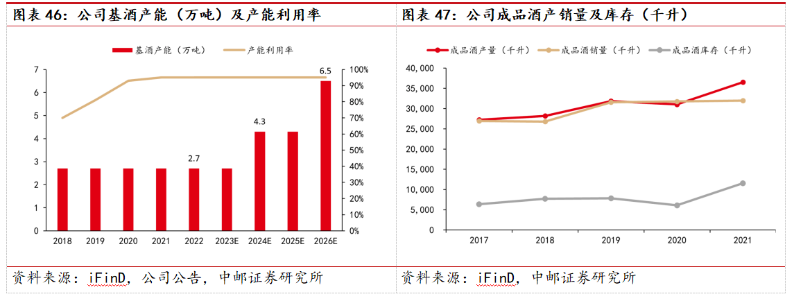 產能擴張效果顯著,基酒儲備豐富。今世緣在基酒產能和儲備設施上的不斷投入帶來產能的擴張和豐富的基酒儲備。公司現有基酒產能2.7萬噸,公司預計未來五年產能利用率能維持在95%上下,成品酒產量從2017年的27218千升提升到2021年的36537千升。庫存方面,2021年半成品酒(含基酒)庫存達到11.5萬千升,成品酒庫存1.2萬千升,總計是當年銷量的4倍。