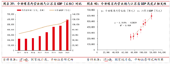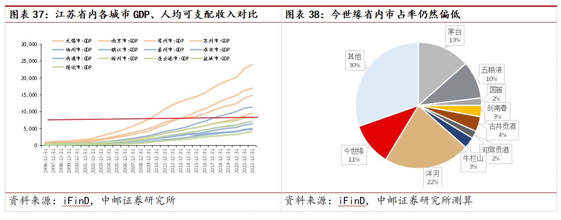 公司省內營收與江蘇GDP呈現高度相關性,中期看仍將持續受益省內消費升級需求。白酒行業周期與宏觀經濟具有強關聯性,尤其中高端白酒,其在政商務和大眾場景中的需求主要以經濟發展和流動性作為前提。2014-2021年江蘇省內營業額和江蘇省GDP對比圖看,二者趨勢高度吻合,經測算,兩組數據相關系數r高達0.98,具有極高的線性正相關性。考慮到江蘇省經濟發達未來經濟發展確定性較強,公司的發展前景樂觀、市占率仍有較大增長潛力。