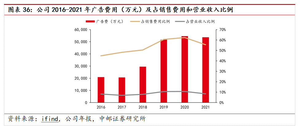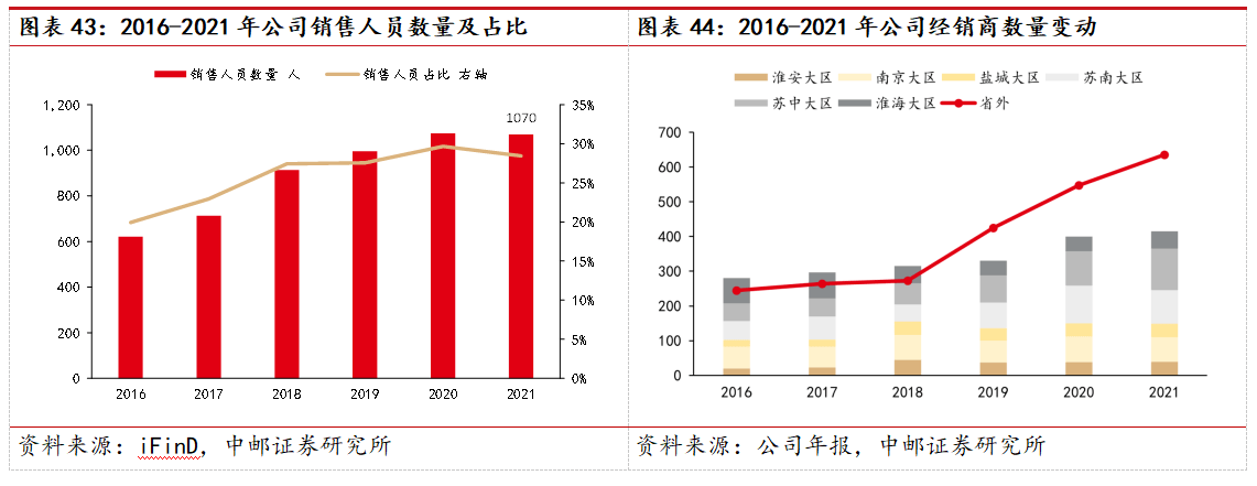 推動渠道扁平化,經銷商網絡和銷售人員規模不斷壯大。2016年之前公司按照行政區域對省內市場進行劃分,設置13個營銷中心,下設市縣辦事處。2018年公司為進一步優化渠道管理架構,推進渠道扁平化,取消市級營銷中心,設置蘇南、南京、蘇中、淮安、鹽城、徐州6個大區,區縣辦事處直接對接大區經理,提高市場響應速度和決策效率。公司經銷商網絡和銷售人員規模在不斷壯大:2016-2021年公司銷售人員從621人增至1070人,銷售人員占比提升8.5pct;2016-2021年公司經銷商數量從525傢增長到1051傢,其中省外經銷商數量增長迅速,由245傢增長到636傢,2019年省外經銷商數量已超過省內。