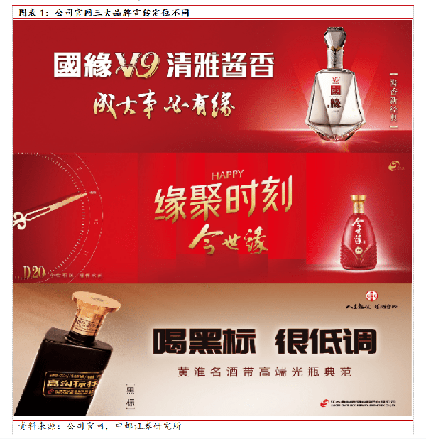 旗下三大知名系列,品牌定位清晰,橫跨不同價格帶。公司是中國白酒上市公司十強企業,蘇酒雙龍頭企業之一。公司主打中度濃香型白酒,現有“國緣”、“今世緣”和“高溝”三大白酒品牌,其中,“國緣”品牌創立於2004年8月,定位“中國十大高端商務白酒”;“今世緣”品牌創立於1996年8月,是“中國十大文化名酒”、“中華婚宴品牌”;高溝酒是“中華老字號”品牌,國傢名優酒。