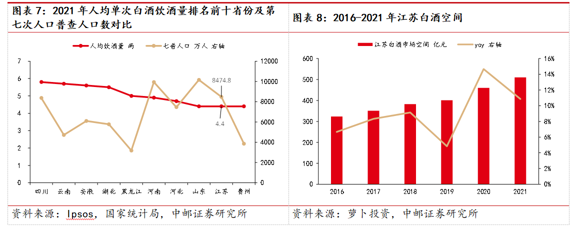 從數據看,江蘇省人均單次白酒飲酒量4.4兩,在人均白酒飲酒量排名前十的省份中,江蘇人口數量名列前茅,第七次人口普查中常住人口8474.8萬人。近年江蘇白酒市場規模不斷擴大,2020和2021年同比增速均超過10%,2021年收入規模超過500億元,在人口數量及人均飲酒量保持相對穩定的前提下,未來白酒消費升級趨勢下,價格帶上移成為蘇酒市場規模擴大的主要驅動力。