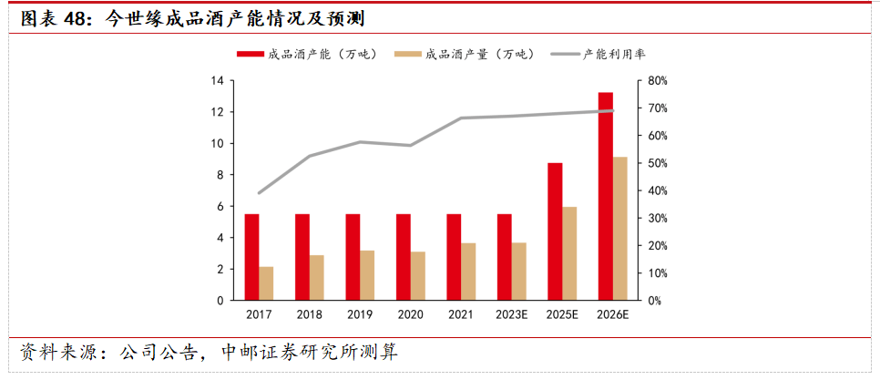 庫存儲備及產能提升為公司百億目標及十四五規劃提供有力支持。今世緣十四五開局之年制定2025年營收過百億,爭取150億的規劃;2023年發展大會上更是提出“五年計劃三年完成”即2023年沖刺百億的宏偉目標。公司在2021年回復函中提出,預計營收100-150億銷售目標對應銷售成品酒6-9萬噸,該目標測算基於2020年51.2億規模對應3.1萬噸成品酒銷售按比例計算得到,實際情況下隨著銷售網絡的擴大以及公司產品整體價格帶的提升,我們預估在2023/2025年實現100/150億目標所需成品酒銷售在4.5/6萬噸,根據現有擴產情況及歷史上基酒使用量和成品酒產量的關系,公司2023/2025年成品酒產能為5.5/8.8萬噸,按2021年的成品酒產能利用率預估,成品酒產量為3.7/5.9萬噸。僅從產能角度分析,2025年公司產能可以支撐150億規模;而2023年由於尚未有新增產能,實現百億目標需要大幅提高產能利用率或消耗公司目前成品酒庫存。但鑒於公司基酒儲備量足夠,短期內產能不會成為公司規模增長的阻力,中長期來看公司的擴產節奏和基酒儲備能夠充分保障公司發展目標的實現。