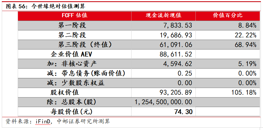 根據絕對估值法,假設公司第二階段持續5年,2025-2030年增長率為7%,2031年起進入永續增長階段,永續增長率2%。同時,根據資本結構和融資成本,計算未來WACC為7.42%,結合第一階段2022-2024年盈利預測,計算得出公司當前合理股價為74.3元。