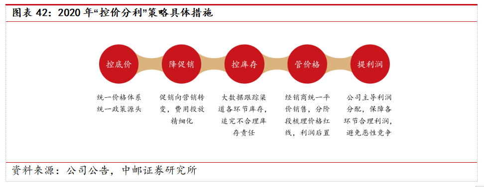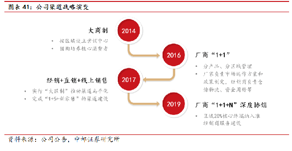 升級“1+1+N”深度協銷,與經銷商及核心終端商共商發展。2019年以來,公司進一步在廠商“1+1”的基礎上升級為“1+1+N”的深度協銷模式,在保持廠商主導地位的同時,加大對終端商的掌控力度,在“1+1”的基礎上將區域20%的核心終端商作為準經銷商來管理,深化營銷變革,提高終端服務水平和促銷執行水平。公司充分保障經銷商的利益:2020年提出“控價分利”模式應對渠道利潤空間收窄的問題,疫情期間公司出臺“緣九條”向經銷商讓利共度難關。公司渠道戰略不斷完善,渠道網絡逐步下沉,終端掌控力提升,實現渠道深度協同。