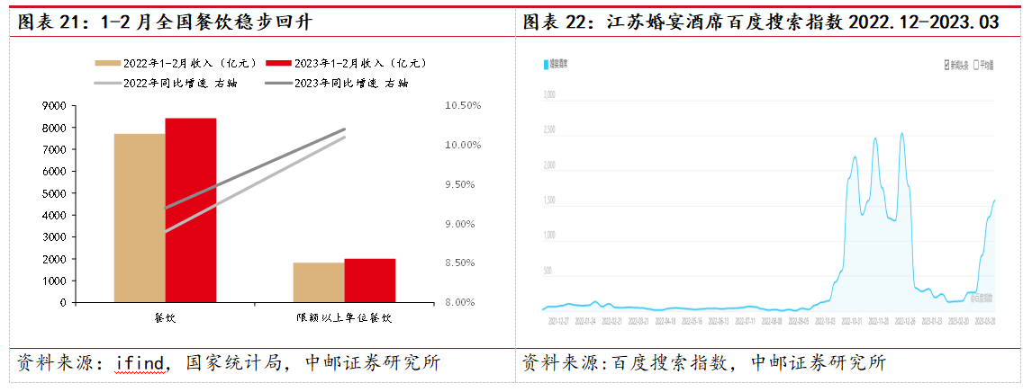 疫後餐飲消費復蘇、婚宴市場回補有望催化公司中高端以下價格帶產品高增長。國傢統計局數據顯示,2023年1-2月份,全國餐飲收入8429億元,同比增長9.2%;而限額以上單位餐飲收入2002 億元,同比增長10.2%,兩者收入增速分別較上年同期上升0.3/0.1pct,同時餐飲收入占社消零售總額占比達10.9%,高於社消零售總額增幅5.7pct,全國餐飲需求率先復蘇。