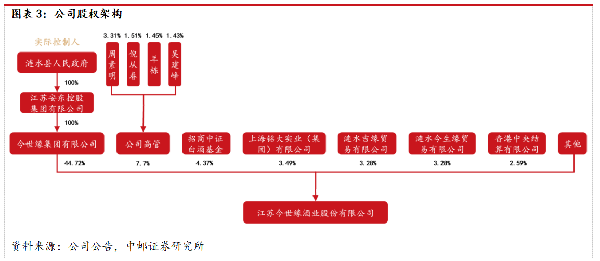 地方政府控股,員工持股比例高。公司實際控制人為漣水縣人民政府,漣水縣政府通過今世緣集團有限公司持股44.72%。公司前十大股東中四位公司高管:周素明、倪從春、羊棟、吳建峰合計持股7.7%,此外,漣水吉緣貿易和漣水今生緣貿易為公司部分高層和骨幹人員持股平臺,合計持股6.56%。公司經營層及中基層人員持股比例較大,將員工利益與公司利益深度捆綁,有利於調動員工積極性。