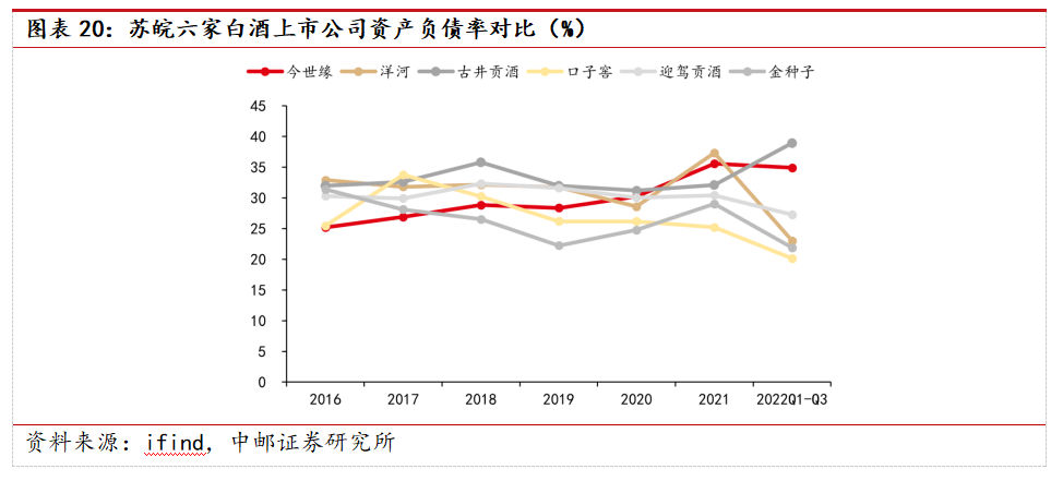 ROE超20%,領跑蘇皖六大白酒企業。除金種子酒外,其他五大白酒上市企業ROE均處在較高水平,公司ROE穩步增長,2018年後一直維持在20%以上,2022年前三季度超越迎駕貢酒領跑蘇皖六大白酒企業。通過杜邦拆解來看,迎駕貢酒較高的ROE來源是較高的杠桿系數;今世緣ROE高於省內競品洋河主要原因是公司庫存壓力相對較低,資產周轉率略高於洋河;ROE略高於迎駕貢酒是由於公司銷售凈利率更高。