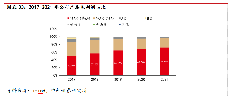 高端產品利潤率可觀,盈利能力持續提升。公司高端產品盈利表現更佳,2021年公司特A級/特A+級毛利率分別為82.6%/66.22%,遠高於B類/C類(優特類)/D類(大曲類)的25.53%/6.84%/3.74%,因此產品結構的提升也帶動公司整體盈利能力的增長,近年毛利率和凈利率平穩增長,2021年毛利率/凈利率分別為74.6%/31.7%,較2016年分別提升3.7/2.2pct。