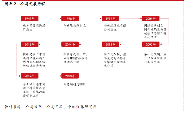 公司歷史悠久,逐步進軍高端市場。公司前身為“三溝一河”(雙溝、湯溝、高溝及洋河)之一的江蘇高溝酒廠,釀酒工藝始於西漢,盛於明清,民國初年當地已有八傢規模較大槽坊,具有豐厚歷史底蘊。1996年,今世緣品牌創立,以“今世有緣,相伴永遠”為品牌理念,塑造“中國人的喜酒”品牌形象。隨後2004年,“國緣”品牌創立,堅持“與大事結緣,同成功相伴,為英雄幹杯”傳播方略,唱響“成大事、必有緣”的品牌宣言。