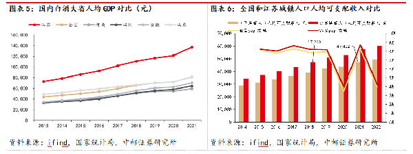 省內白酒企業營收增長與江蘇經濟水平高度相關。江蘇省經濟發展水平在全國范圍內處於領先位置,作為工商業發達的老牌經濟大省,江蘇城鎮化、居民收入、消費支出水平較高。2021年江蘇省GDP為11.6萬億元,創造全國10.2%的GDP,僅次於廣東省,排名全國第二位,人均GDP高達13.7萬元,遠遠高於全國平均值及山東、河南等白酒大省,江蘇省與全國城鎮人口人均可支配收入同頻變動,江蘇2018年已和全國2021年持平,居民財富不斷積累,次高端及高端白酒的主要消費群體規模不斷擴大。