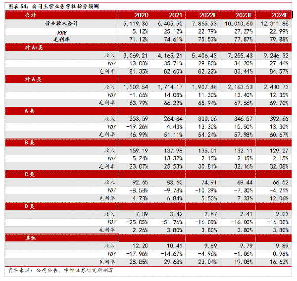 1)核心的四開省內增長穩健省外率先發力、國緣 V3 完成培育開啟放量,分別卡位省內400元和600 元消費升級價格區間,正進入放量階段;同時公司確立省外聚焦四開的產品策略,未來增長空間廣闊;我們預計特 A+類產品保持高增長,預計特 A+類 2022-2024 年營收同比增長 29.8%、34.2%、27.4%,毛利率分別為82.2%/83.4%/84.6%。