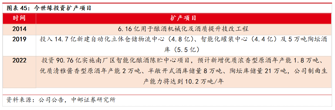 公司擴張產能鞏固儲能,2022年斥資90億擴產助力百億夢。伴隨市場消費擴張,公司規模不斷擴大、產能日趨飽和,自上市來公司陸續出臺產能擴張計劃,2022年更是斥巨資實施擴產,計劃新建產能3.8萬噸(其中新增濃香型原酒年產能1.8萬噸、優質清雅醬香型原酒年產能2萬噸),新增半敞開式酒庫儲量8萬噸、陶壇庫儲量21萬噸,制曲生產能力將達到10.2萬噸/年。按照計劃,其中1.6萬噸產能2024 年上半年建成投產,剩餘產能在2026年全部建成投產,屆時產能將達到6.5萬噸,是公司現有產能的2.4倍。