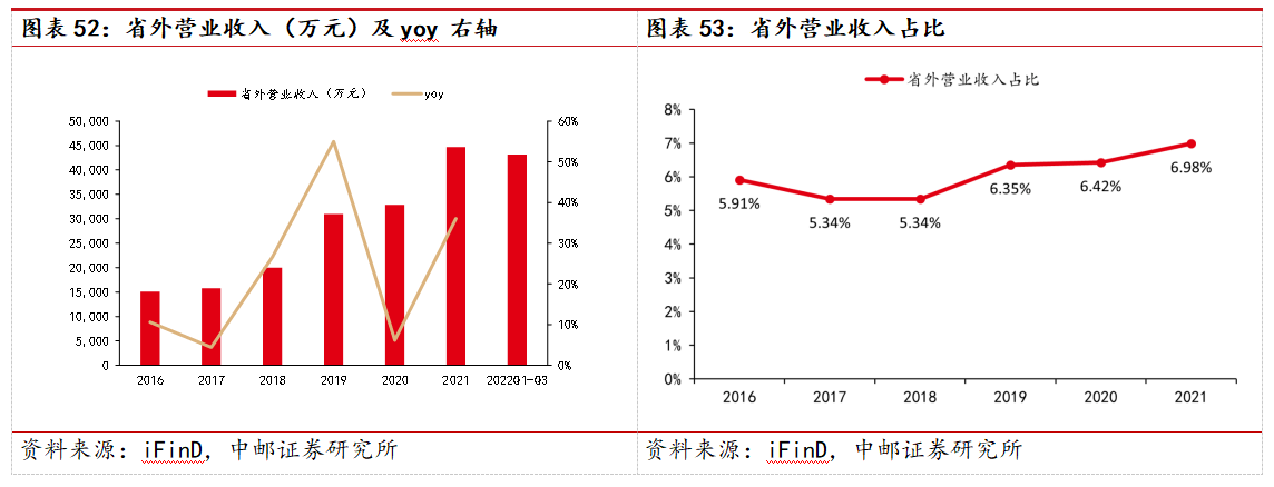 公司事業部改革後,對省外市場的重視程度明顯提升。2022年6月公司推出內部組織機構改革,實施分品牌事業部制,成立“省外事業部”,鼓勵省內人才出省,對於省外事業部簡政放權,優化營銷中心及辦事處業務流程,做好省外市場突破的基礎準備,也彰顯公司對於全國化戰略的重視程度。
