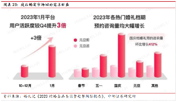 婚宴回補需求旺盛,預計全年持續釋放無淡季。疫情期間受各地防控政策限制以及人員流動管控影響,部分婚宴需求推遲至2023年集中釋放。根據婚禮《2023結婚全品類消費趨勢洞察報告》數據,2023年1月起平臺活躍數量較22年Q4提升3倍,同時消費者對於2023年各節假日婚禮預約咨詢量環比元旦前也均有大幅提升。從江蘇地區百度搜索指數看,2022年10月起搜索人數開始大幅走高,放開前日均搜索量在雙位數量級,而放開後快速攀升至四位數,較疫情期間提升近50倍。