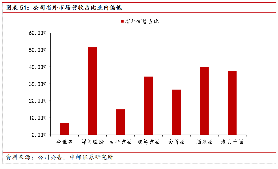 公司持續佈局省外市場,全國化成為戰略重點。公司2021年省外營收僅為4.47億元,占總營業收入的6.98%。與其他白酒公司對比,公司省外占比業內偏低。