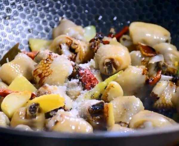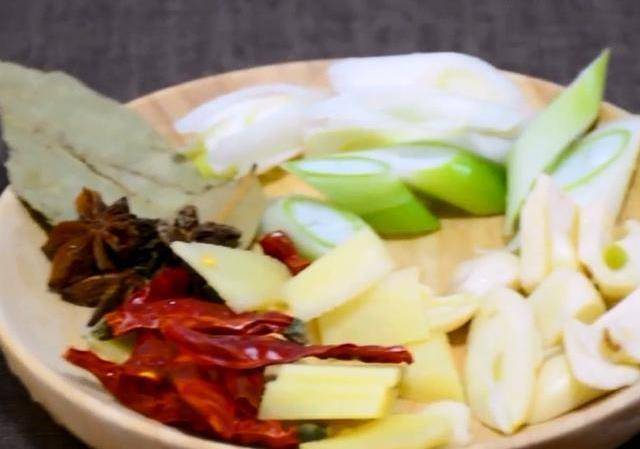 白砂糖炒化後,把幹辣椒,薑片,蒜片,香葉,八角,蔥段放入爆香,