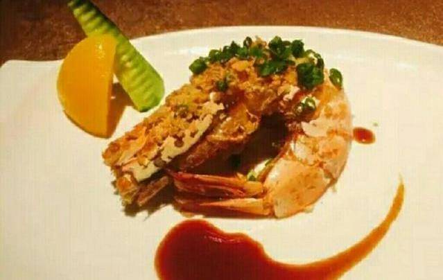 3.鍋留底油放入黃油爆香料頭,倒入少許雞湯,放入調味料煮開,將煎制好的蝦放入慢火收汁即可。