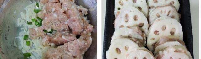 1半肥瘦買回傢剁成肉餅、加入調味料三份一茶匙鹽,糖一茶匙,雞粉半茶匙,少量胡椒粉攪勻備用,蝦仁清洗切粒加入肉餅,沖,蓮藕粒一齊攪勻,放入雪櫃雪大概1小時取出,蓮藕切薄片切粒備用,