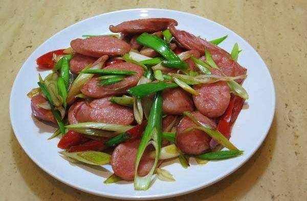 作法:香腸切薄片,蒜苗切小段。放油熱鍋後,先煸薑末,香味出來後,放香腸,利用香腸的油分繼續炒出香味,這時加入一點水燜一會,等水收幹,加入蒜爆炒即可。喜歡吃辣的人可以加點辣椒調味。