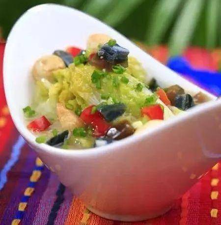 娃娃菜;皮蛋;紅彩椒;鹽;蒜子;香蔥末;濃湯煲雞湯沏開一大碗;水淀粉一碗